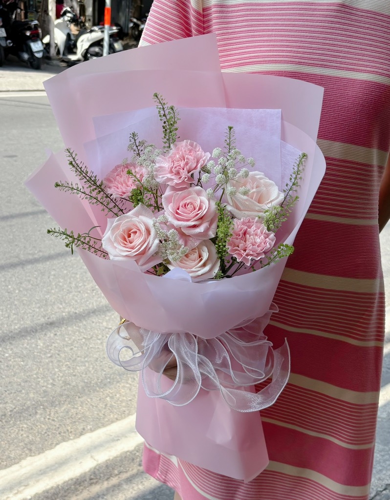 Bó hoa kết hợp từ hoa hồng pastel hồng nhạt, cẩm chướng hồng phấn, hoa baby trắng và lá xanh mềm mại, mang lại cảm giác trong trẻo, thuần khiết và rất "nàng thơ". Tone hồng pastel ngọt ngào được gói trong lớp giấy cùng màu, điểm nơ trắng mềm mại – tạo nên một tổng thể dễ thương, nữ tính và tinh tế.