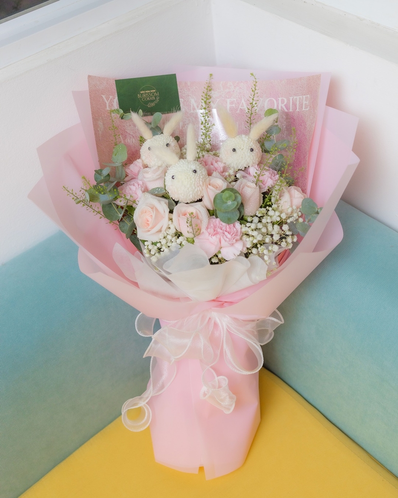Bó hoa được kết từ những đóa hồng pastel nhẹ nhàng, phối cùng baby trắng, cẩm chướng hồng phớt và lá bạc eucalyptus. Điểm nhấn chính là những chú thỏ bông nhỏ xinh làm từ hoa pingpong, mang đến cảm giác đáng yêu, tươi vui và đầy bất ngờ.
