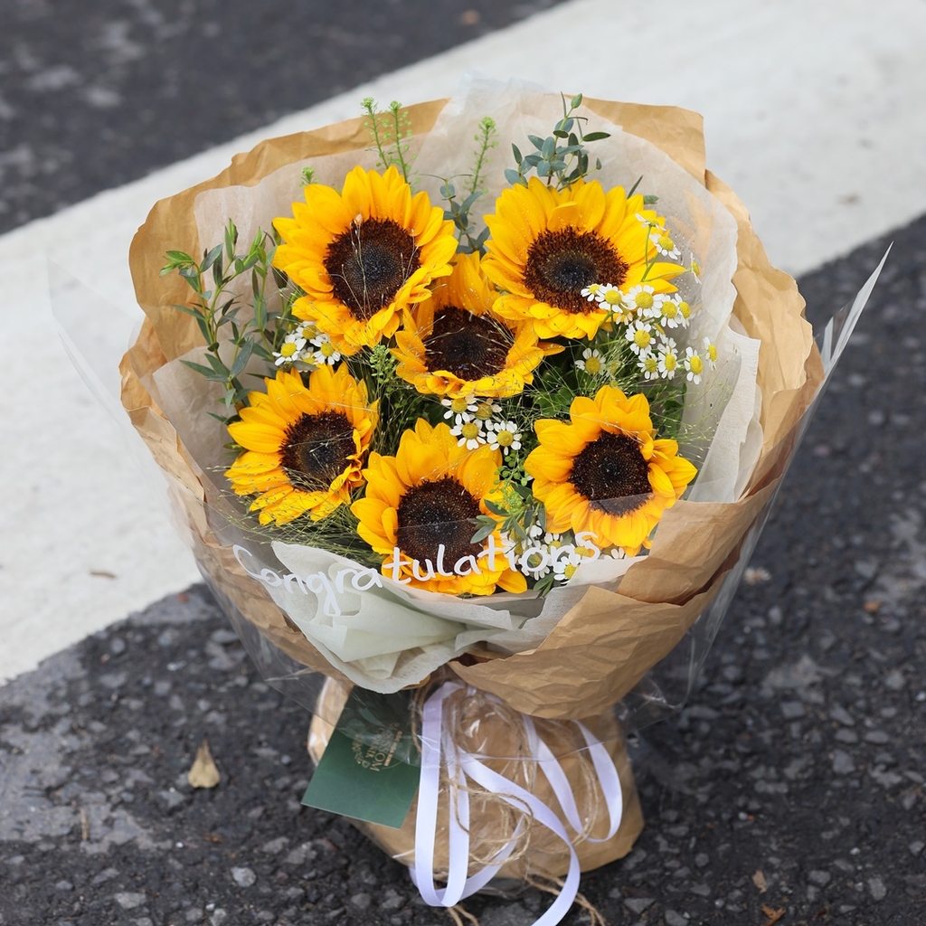 Bó hoa được kết từ những đóa hướng dương rực nắng, biểu tượng của niềm tin, sức sống và khát vọng vươn lên. Xen lẫn là những bông cúc nhỏ trắng tinh khôi và lá xanh nhẹ nhàng, tạo nên tổng thể hài hòa, sinh động và mang năng lượng tích cực.