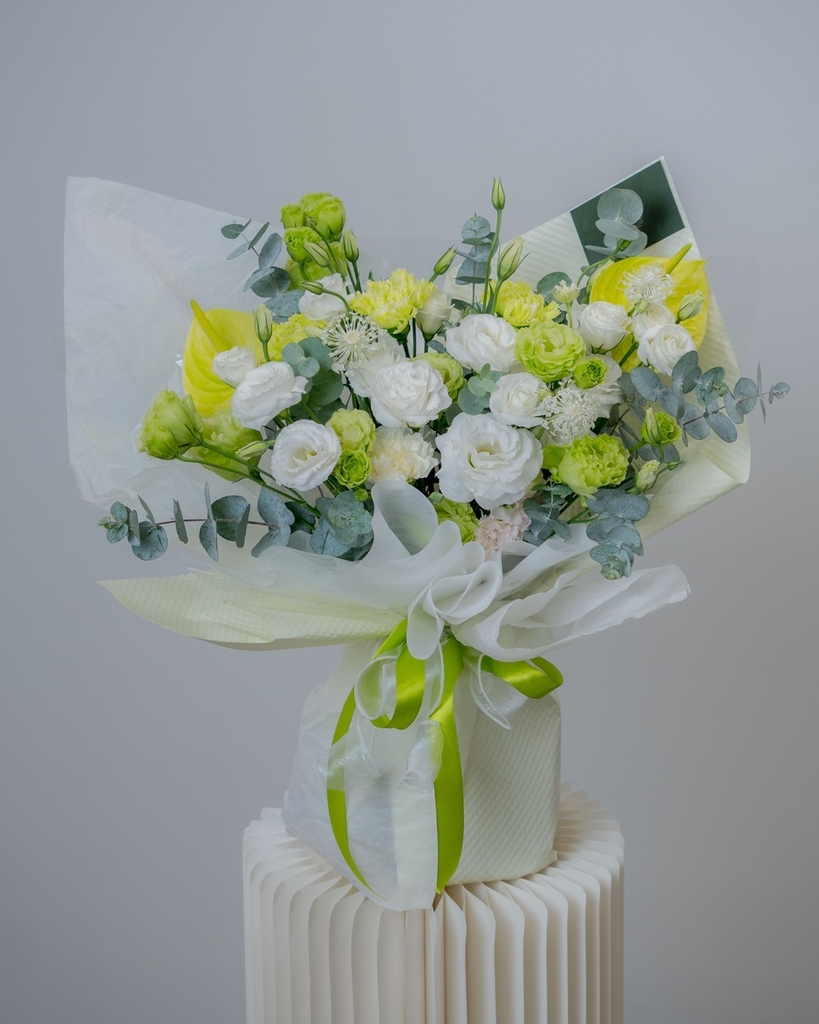 Mang tông màu trắng – xanh mát – vàng chanh thanh khiết, bó hoa được thiết kế từ cẩm chướng trắng xanh thanh thoát, kết hợp cùng hoa hồng môn vàng chanh – biểu tượng của sự may mắn và phồn thịnh.