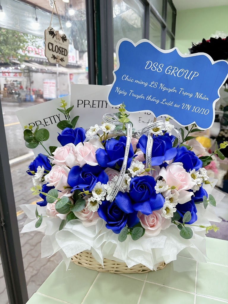 Giỏ hoa được kết hợp từ những bông hồng sáp xanh dương mạnh mẽ, hồng pastel nhẹ nhàng và điểm hoa nhí trắng, phối kèm ruy băng trắng đen thời trang, lót giấy trắng cao cấp – tạo nên tổng thể sang trọng, chuyên nghiệp và hiện đại.