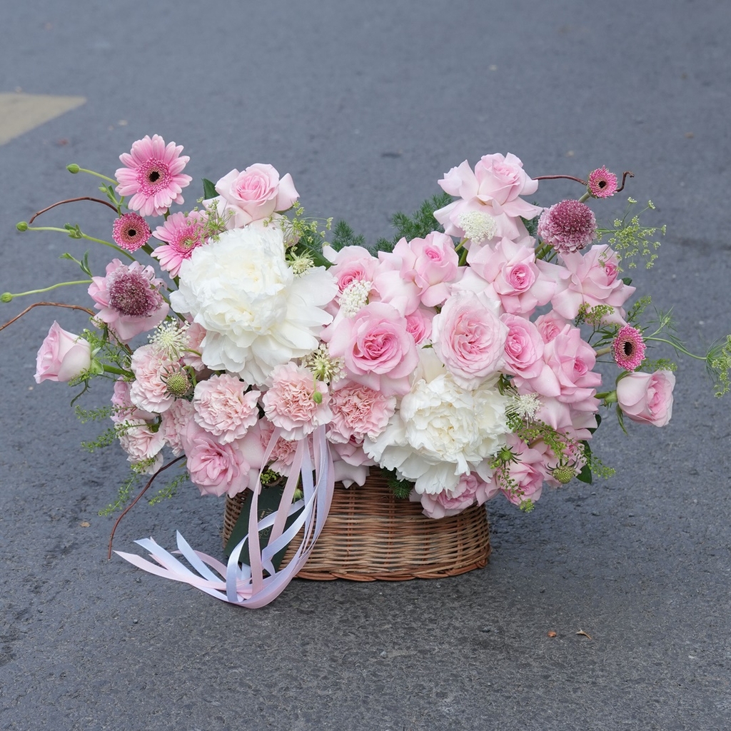 Giỏ hoa tone hồng pastel – trắng, dáng bán nguyệt, mang nét ngọt ngào – thanh lịch